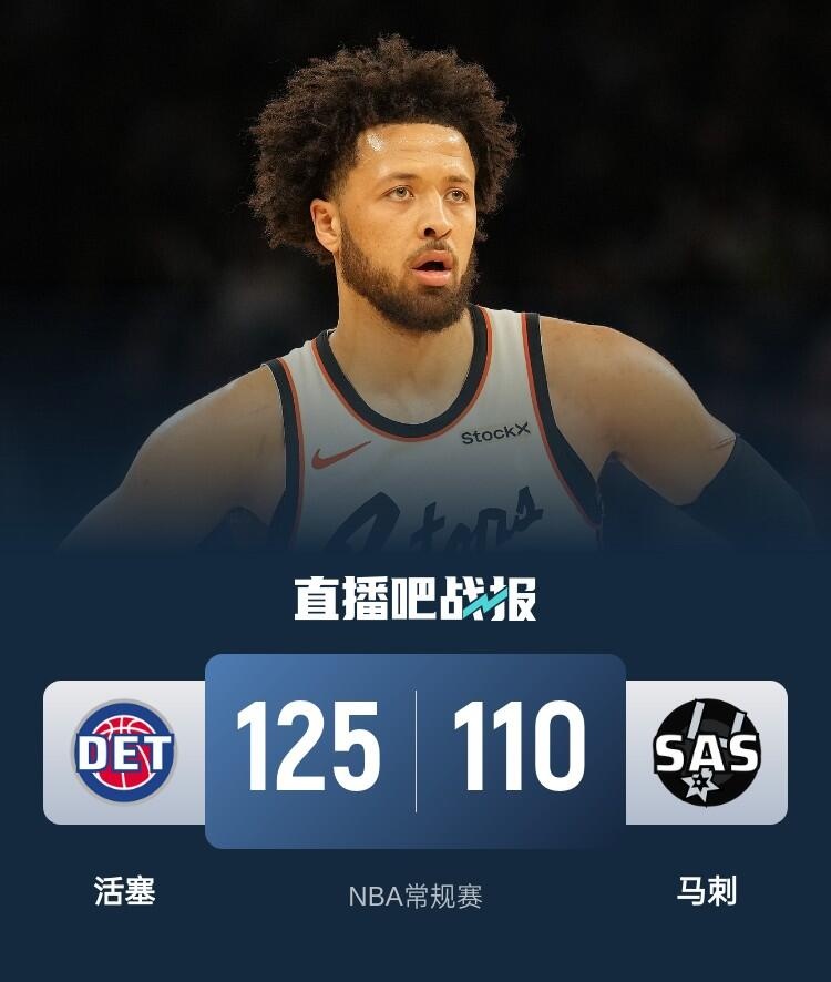 首节开打后活塞反客为主轰出13-2开局,马刺逐渐找到手感,福克斯联手卡斯尔率队追分,但活塞连续杀伤内线强势回应,首节结束时活塞领先9分,次节回来,福克斯延续火力连投带罚蚕食分差,中段马刺一度反超,哈里斯连中三分及时止血,半场战罢,活塞保有1分优势。易边再战后马刺进攻再度停滞,活塞多点开花连续轰出小高潮,三节结束后活塞已经领先21分,末节上来,凯尔登突投结合接连砍分,无奈活塞总能回应,最终活塞125-110大胜对手迎来5连胜。