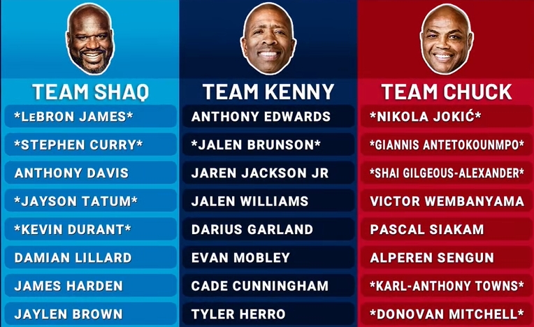 ⭐每支全明星球队将有八名球员,并以TNT NBA分析师的名字命名,24名NBA全明星球员将被平均分成三支球队,名单由TNT解说员和球队荣誉经理查尔斯-巴克利、沙奎尔-奥尼尔和肯尼-史密斯选出。
