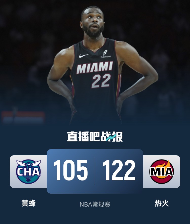 上半场,黄蜂率先发力,多点开花占据主动,次节热火大举反击,维金斯里突外投,希罗也高效输出,黄蜂突然哑火,热火轰出22-2的进攻狂潮确立两位数优势,半场战罢热火57-47领先黄蜂。下半场,维金斯延续火力,单节独得15分一举将分差拉开到20分以上,末节黄蜂奋力追赶,又是维金斯挺身而出内外开花拿分杀死比赛。最终,热火122-105击败黄蜂,结束了自己的10连败。