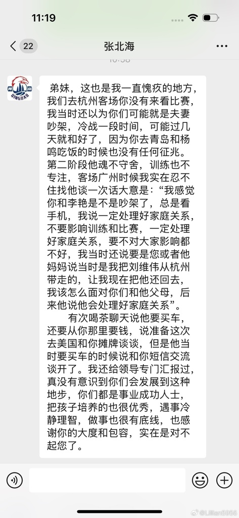 04月03日讯 CBA青岛男篮主帅刘维伟的妻子,今天凌晨在微博发布长文,控诉刘维伟出轨有夫之妇。而在她与青岛总经理张北海的聊天记录里,还透露了刘维伟在本赛季CBA联赛的第二阶段有点“魂不守舍”。