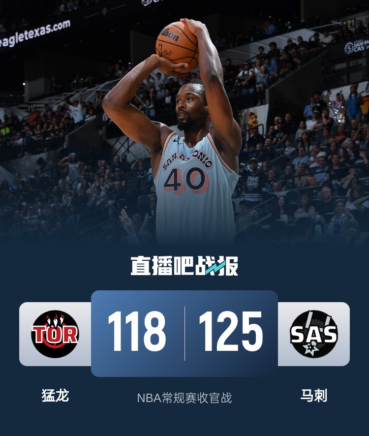 比赛开始,巴恩斯接连三分帮助马刺建立主动权,但猛龙巴特尔外线手感火热单节6记三分带领猛龙咬住比分,坦普尔受伤离场,首节猛龙领先5分,次节双方拉锯战,斯科蒂-巴恩斯里突外投单节轰下17分,卡斯尔苦苦支撑,猛龙半场领先到20分。下半场,双方展开拉锯战,马刺多点开花接连外线发炮,一波24-7攻击波直接追平比分,三节猛龙仅领先2分,末节双方展开胶着拉锯战,凯尔登强投三分助马刺反超5分,随后双方展开拉锯战,凯尔登还是连续攻筐助马刺守住两球以上领先,最终马刺125-118逆转猛龙。