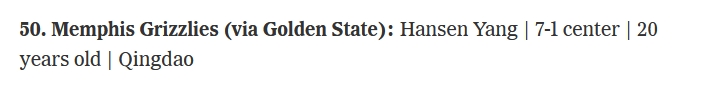 在最新一期的榜单中,除了状元大热弗拉格稳居榜首外,中国球员杨瀚森排在了次轮总第50顺位,被灰熊用勇士签选中。
