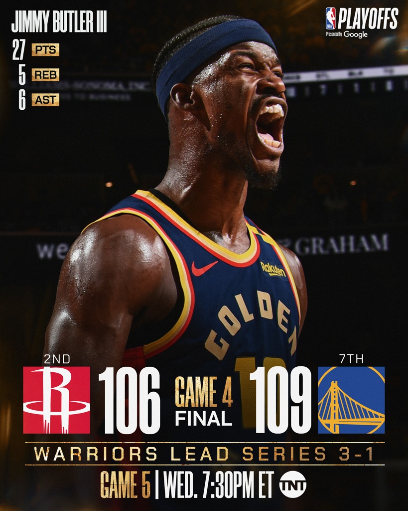 勇士在主场以109-106险胜来访的火箭,将大比分改写为3-1,拿到了系列赛赛点。巴特勒末节独揽14分+抢下关键篮板,追梦防下申京(31分10板5助2断)的绝杀球,库里贡献17分,范弗里特8记三分成空砍。