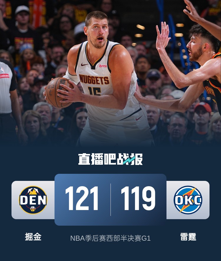 掘金(1-0):约基奇42分22板6助2帽、阿隆-戈登22分14板1助、穆雷21分6板6助、威斯布鲁克18分2板2助、布劳恩11分13板3助、沃特森3分1板2断2帽、波特2分4板、斯特劳瑟2分1板