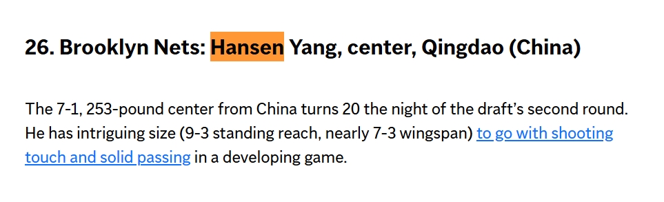 重磅媒体美联社模拟选秀:杨瀚森首轮第26顺位被篮网选中!