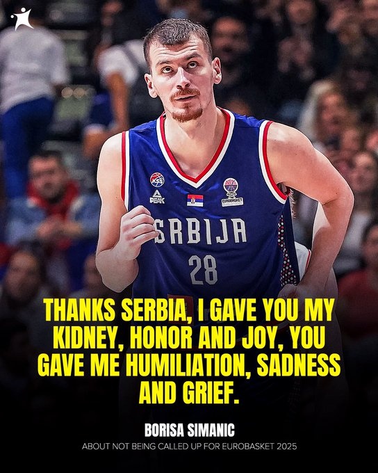 西马尼奇在个人INS上写道:“谢谢塞尔维亚男篮。我给了你一颗肾脏、荣誉和快乐,你给了我羞辱、悲伤。”
