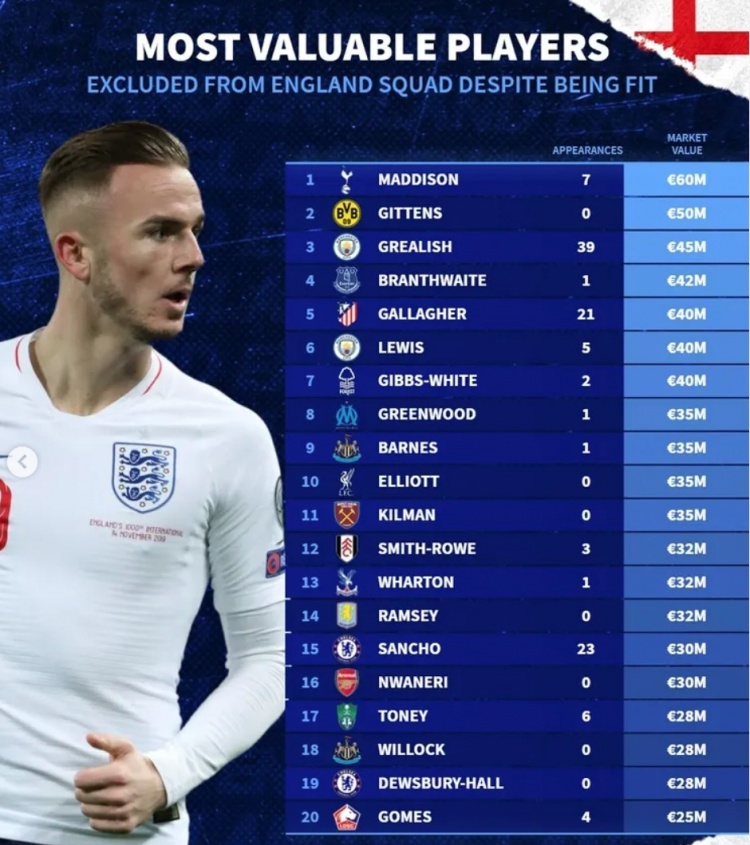 德转列落选英格兰队的健康球员身价榜:欧元(及生涯国家队出场数)