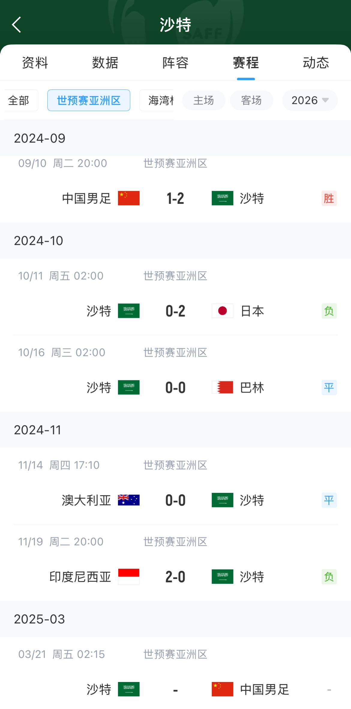 沙特队在本届18强赛上一个进球,还是第二轮对阵中国队时打进,当时哈桑-卡德什在第90分钟打入制胜一球。此后,沙特队在连续四场比赛中未能进球,分别为对阵日本、巴林、澳大利亚和印度尼西亚,总计360分钟。尽管沙特队在这四场比赛中完成了52次射门,平均每场13次,但始终未能攻破对手的球门。
