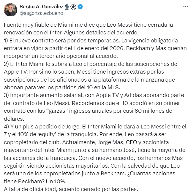 04月25日讯 西班牙记者Sergio González报道,梅西将与迈阿密续约2年,梅西会大幅涨薪,并且梅西将收到迈阿密7%到10%的股权。