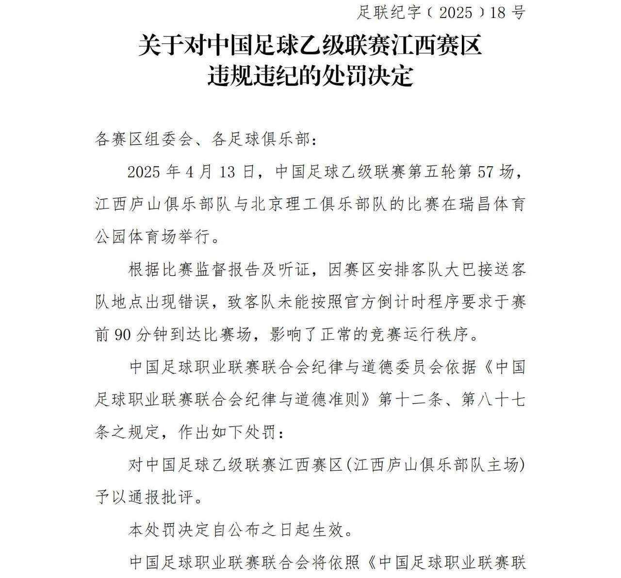 4月13日中乙江西庐山1-1北京理工,根据比赛监督报告及听证,因赛区安排客队大巴接送客队地点出现错误,致客队未能按照官方倒计时程序要求于赛前90分钟到达比赛场,影响了正常的竞赛运行秩序。